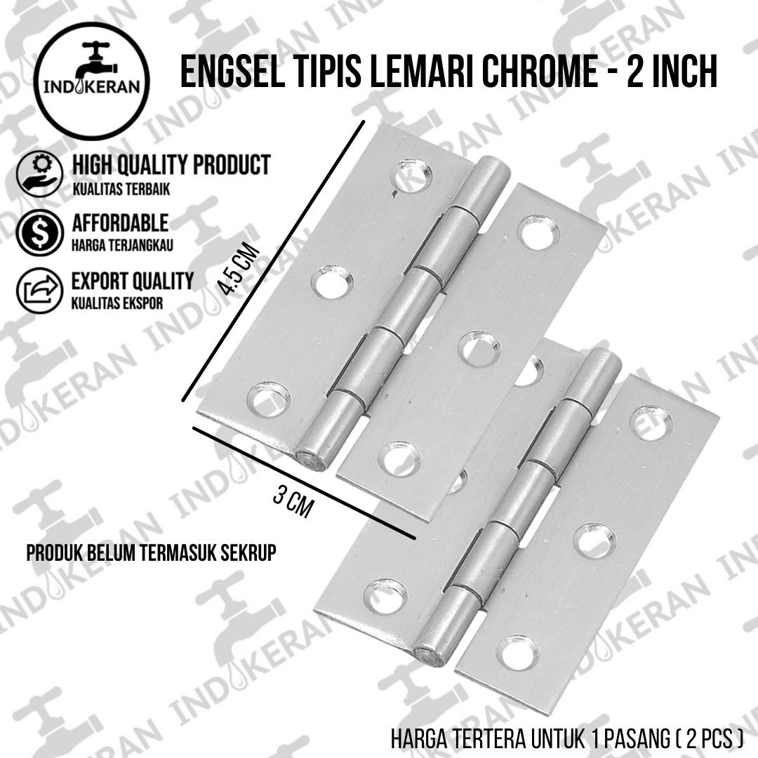 INDOKERAN - Engsel Tipis Lemari Chrome - 2 InchSpesifikasi:Ukuran : 2 InchWarna : ChromeFungsi :Untuk Menyambungkan papan kepada jendela agar dapat berputar pada porosnya.Keunggulan:- Bahan terbaik- Mudah dip