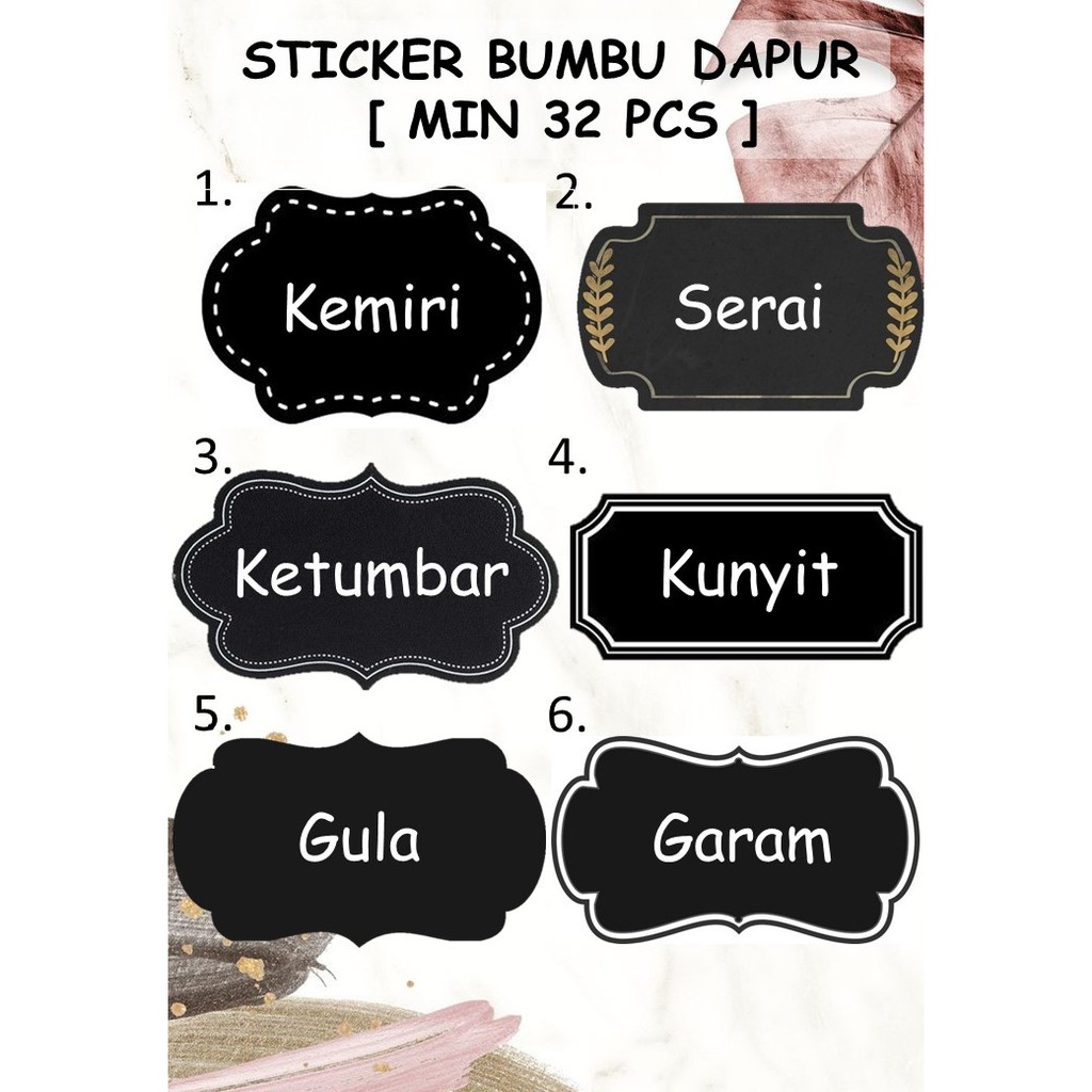 * ukuran gambar 5cm × 3cm* untuk kualitas kita menggunakan stiker high quality glossy* stiker waterproof * sudah digunting tinggal ditempel* minimal order 32pcs [ selebihnya kelipatan ]* bisa request nama bumbu* silakan isi di pesan untuk jenis font/huruf dan juga nama-nama bumbu yang ingin dicetak ... happy shopp
