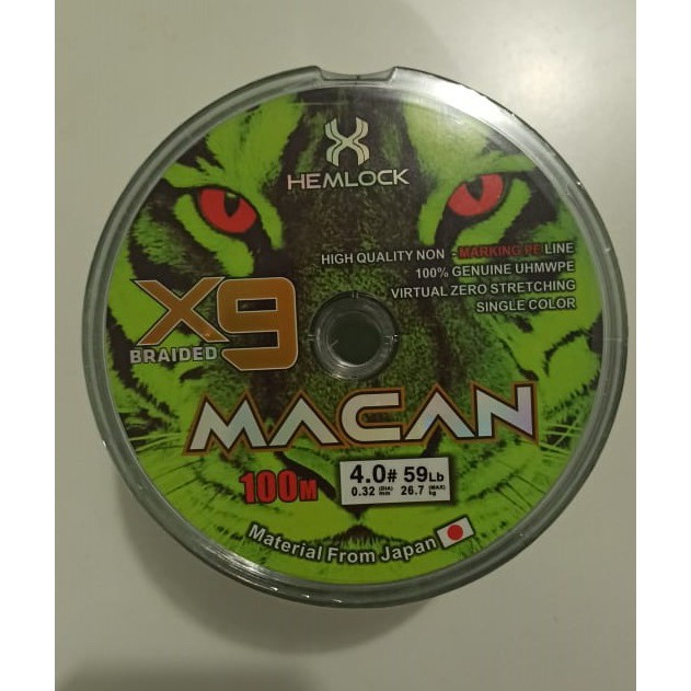 WATER LINE HOMELOCK X9 BRAIDED MACAN HIGH QUALITYHIGH QUALITY NON – MARKING PE LINE100% GENUINE UHMWPEVIRTUAL ZERO STRETCHINGSINGLE COLOR (GREEN)100 METERPE. 4.0 – 59 LB (26,7 KG MAX)0,32 mm (